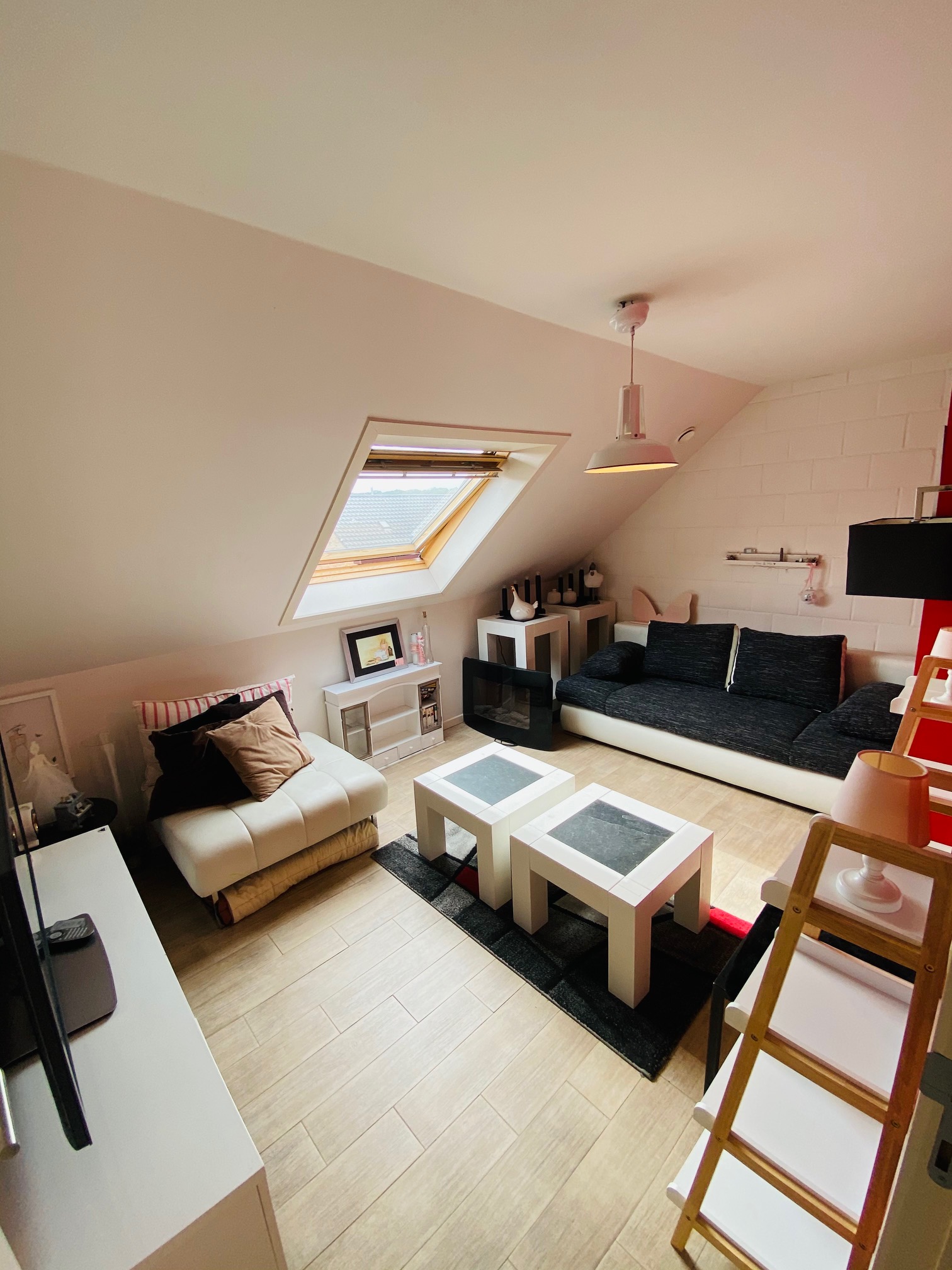 op de 1ste verdieping: 2 ruime slaapkamers, badkamer met dubbel lavabomeubel, hangtoilet en ligbad/douche.