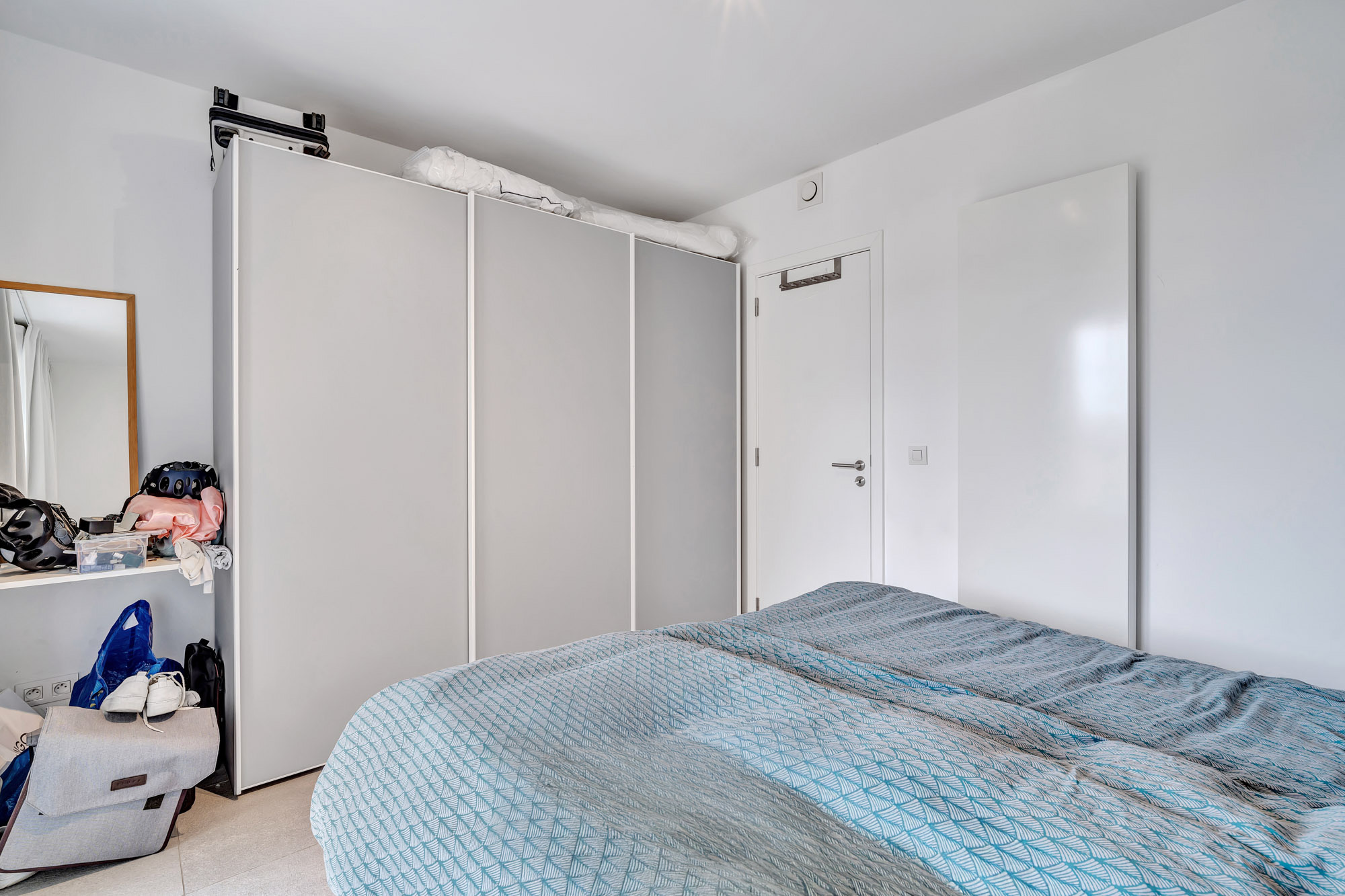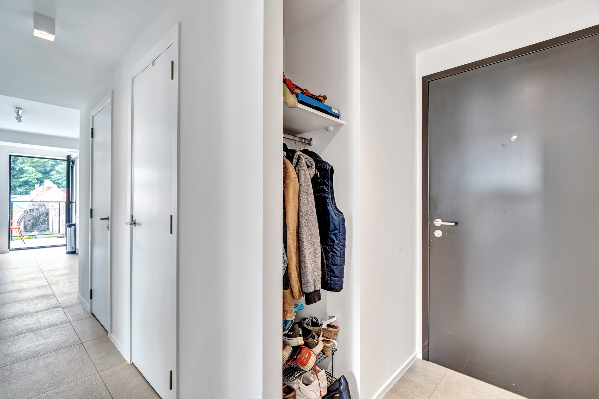 Het bestaat uit een inkomhal met apart toilet en wasruimte, een ruime leefruimte met eetkamer en volledig uitgeruste open keuken, twee comfortabele slaapkamers, een badkamer met inloopdouche en dubbele wastafel, evenals een extra douchekamer. Prachtig oostgericht terras van ±18 m².