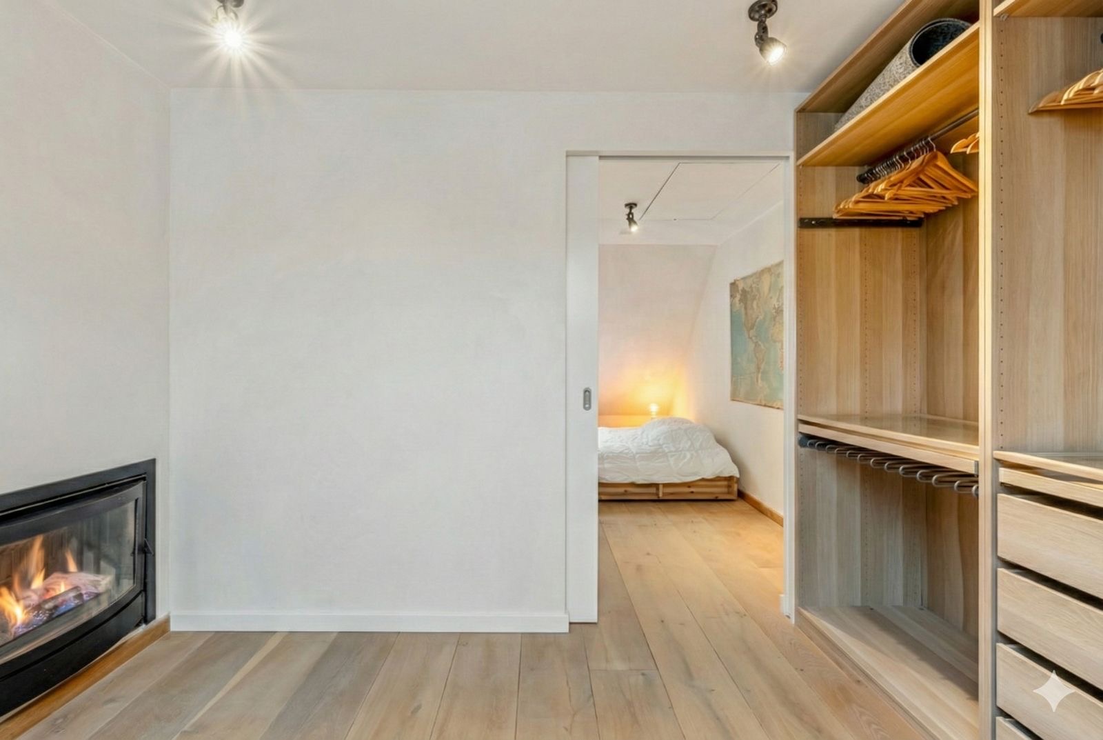 Op de verdiepingen vinden we vandaag één ruime master bedroom met dressing/bureel en een gezellige gashaard voor extra sfeer. De woning biedt echter verrassend veel potentieel: mits eenvoudige ingrepen kan je vlot uitbreiden naar 2 slaapkamers (en zelfs 3 indien gewenst), door de master op te splitsen en/of de TV-living op de eerste verdieping om te vormen.